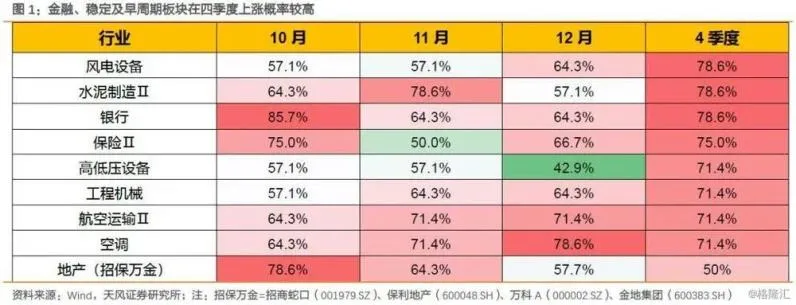 按照天風(fēng)策略的行業(yè)分類,保險(xiǎn)、工程機(jī)械、鐵路等業(yè)績(jī)穩(wěn)定板塊在四季度上漲概率超過(guò)80%;受益于四季度基建相關(guān)政策的密集出臺(tái),工程機(jī)械、水泥、重卡在四季度跑贏大盤概率超過(guò)70%。