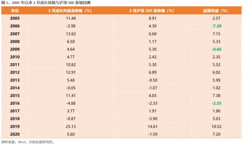 天風(fēng)證券策略團(tuán)隊(duì)指出2月份成長(zhǎng)股更占優(yōu),通過(guò)回溯2005年以來(lái)2月的市場(chǎng)表現(xiàn)來(lái)看,科技成長(zhǎng)板塊在2月實(shí)現(xiàn)上漲的概率達(dá)到75%,跑贏滬深300的概率達(dá)到81.25%。