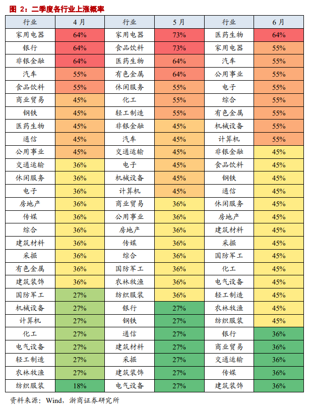 進(jìn)入4月份,春季行情往往進(jìn)入尾聲。浙商證券統(tǒng)計(jì)發(fā)現(xiàn),相較于一季度,各行業(yè)上漲概率整體下降;在主升行情后期,大金融補(bǔ)漲,銀行、非銀、家電、汽車、食品飲料等上漲概率居前。