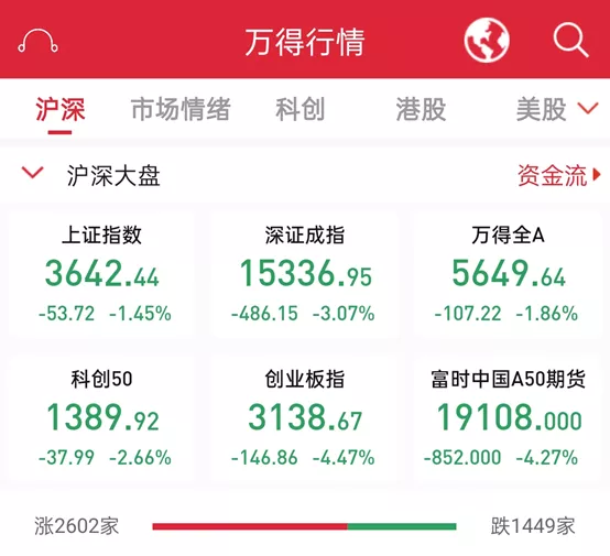 2月22日,A股各大指數(shù)全線下跌,其中創(chuàng)業(yè)板指大跌超4%。截至收盤(pán),上證指數(shù)跌1.45%報(bào)3642.44點(diǎn),深證成指跌3.07%報(bào)15336.95點(diǎn),創(chuàng)業(yè)板指大跌4.47%報(bào)3138.67點(diǎn)。