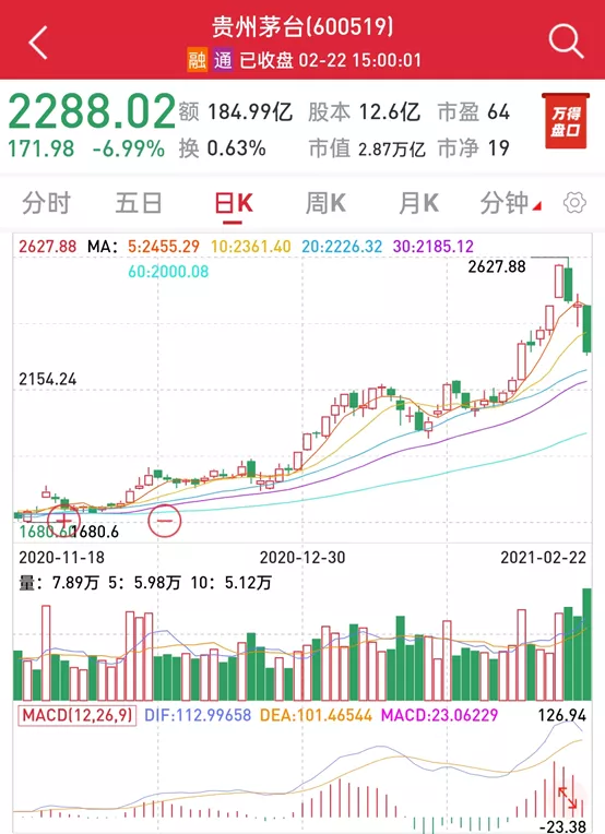 當(dāng)日,貴州茅臺(tái)罕見(jiàn)跌近7%,收于2288.02元/股,總市值跌落3萬(wàn)億元。值得一提的是,在最近的三個(gè)交易日,貴州茅臺(tái)股價(jià)連續(xù)跌破2500元、2400元、2300元關(guān)口。