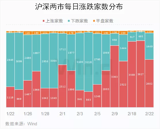 Wind數(shù)據(jù)顯示,從2月5日開(kāi)始,滬深兩市上漲個(gè)股開(kāi)始增多,2月5日為1248家,較上日增加385家,2月8日增加755家至2003家,2月9日再增加1360家達(dá)到3363家,此后,A股上漲公司家數(shù)均多于下跌公司家數(shù)。