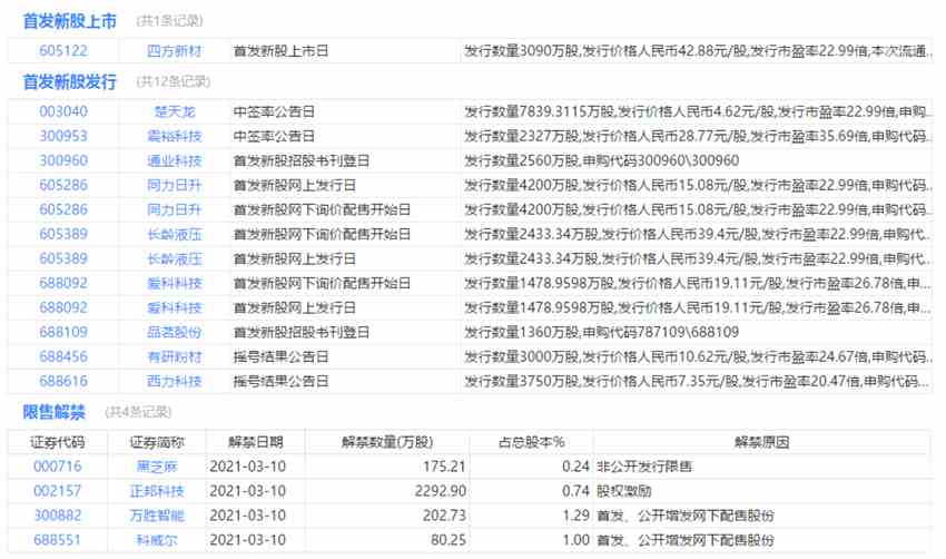 今日上市、申購、限售解禁等提醒: