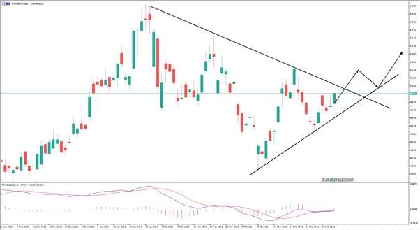 如果說電池技術(shù)是電動車的心臟,那么鋰礦就是電池的核心。從去年12月開始,隨著需求量擴(kuò)大,鋰礦的價格一路飛漲,推動鋰礦股股價上漲。從Orocobre日線圖來看,股價在經(jīng)歷3個月的單邊上漲后,伴隨特斯拉的下跌,股價也逐步震蕩回調(diào)。目前K線形成了收斂三角形的形態(tài),并接近收斂尾端。伴隨這次電動車行業(yè)的利好消息,股價有突破上方趨勢線的可能。指標(biāo)方面,MACD正在零線附近糾結(jié),釋放多空爭斗信號。整體來看,可以配合突破三角形上沿順勢入場多單。不過考慮到上方仍然存在套牢賣壓力,可以等待突破后回調(diào)到上升趨勢線,再行入場多單。支撐點(diǎn)位看5的整數(shù)位大關(guān),入場時機(jī)可以配合MACD的金叉形態(tài)。