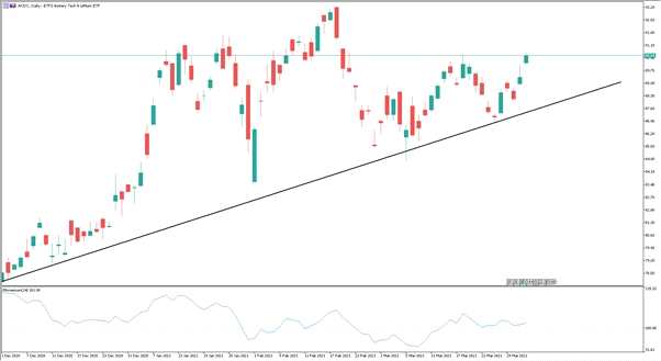 由于電動車行業(yè)長期受到資本的追捧,個股的泡沫風(fēng)險較大。對于散戶而言,股票指數(shù)基金ETF能夠分散地緣及個股風(fēng)險,是更好的交易選擇。ACDC作為電池技術(shù)與鋰礦ETF具有較強(qiáng)的分散風(fēng)險功能。從ACDC日線圖來看,下方趨勢線提供了良好的支撐,多次推動價格反彈。受到昨日消息面利好,股價開始走高,更是在今日早盤跳空上漲,整體表現(xiàn)出了強(qiáng)上漲動力。指標(biāo)方面,動量指標(biāo)在零線上方站穩(wěn),指標(biāo)穩(wěn)步上漲,表示買方力量在逐漸入場?,F(xiàn)價已經(jīng)抵達(dá)了90.5的前高點(diǎn)位置,并有突破跡象。整體來看是上漲趨勢,現(xiàn)價下方支撐在今日的跳空缺口90附近,再下方的支撐在趨勢線上88附近。