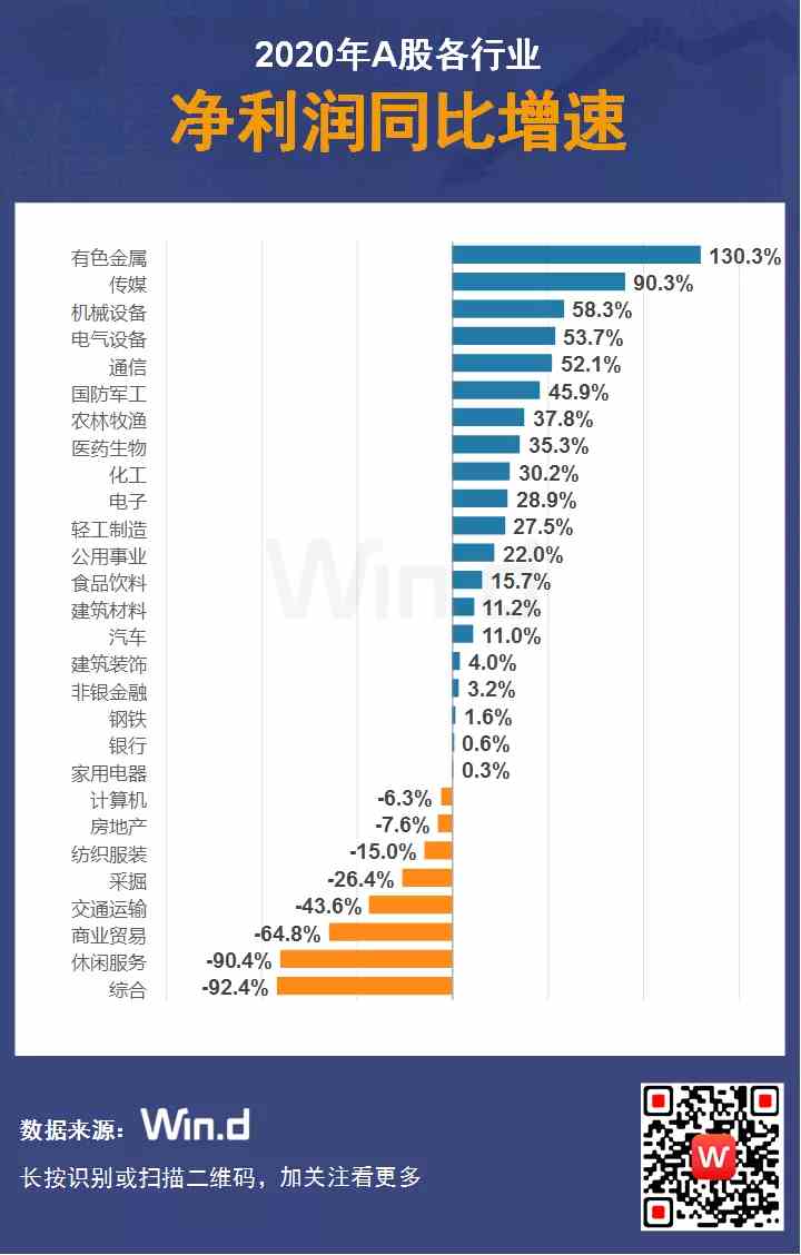 2020年,受益于大宗商品價(jià)格上漲,有色金屬行業(yè)凈利潤增長最為明顯,同比增速達(dá)130%,傳媒、機(jī)械設(shè)備、電氣設(shè)備、通信等行業(yè)凈利潤增速亦較高。此外,因疫情影響,綜合、休閑服務(wù)凈利潤下滑均超過90%。