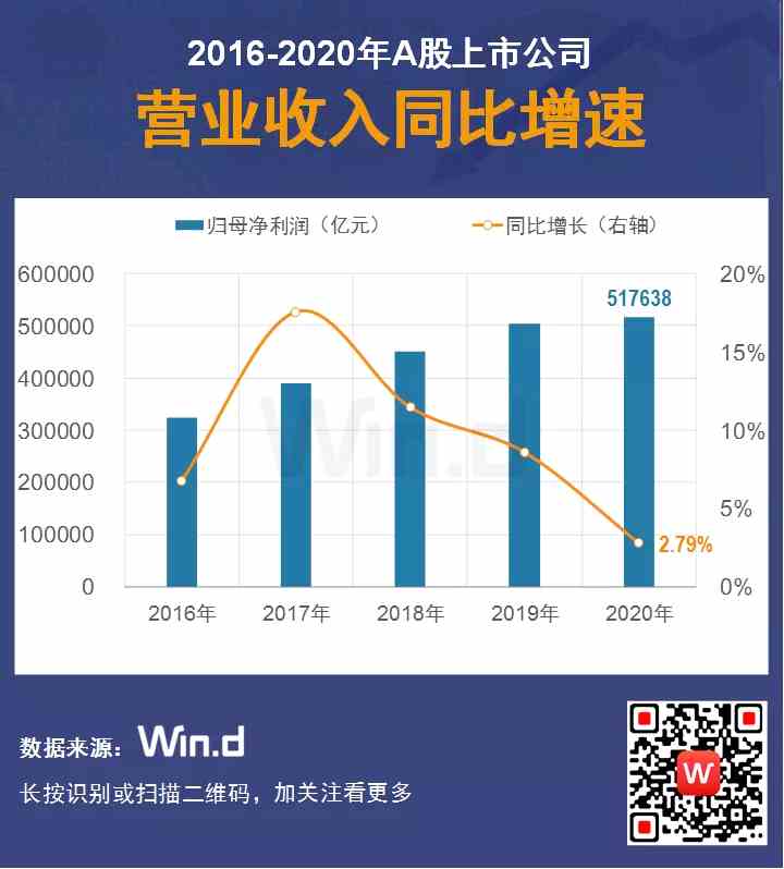 2020年A股上市公司合計(jì)實(shí)現(xiàn)營業(yè)總收入51.76萬億元,同比增長2.79%,營收持續(xù)增長。
