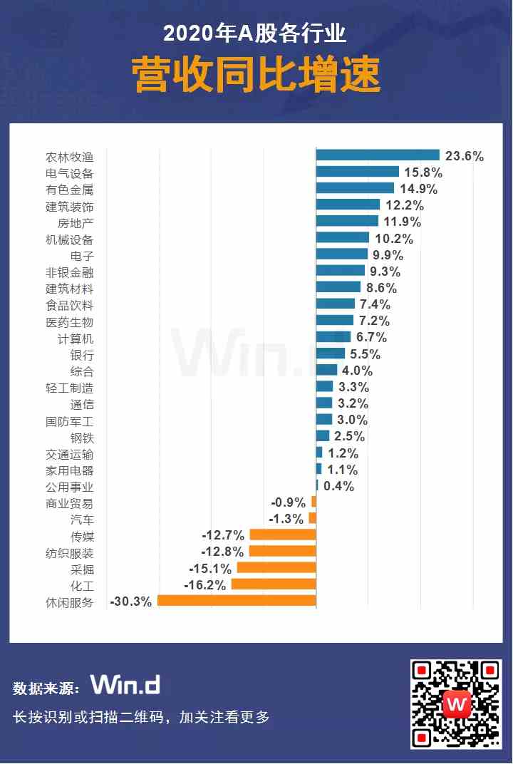 2020年?duì)I業(yè)收入呈現(xiàn)增長的有農(nóng)林牧漁、電氣設(shè)備、有色金屬、建筑裝飾、房地產(chǎn)等21個(gè)行業(yè),占比超過70%。