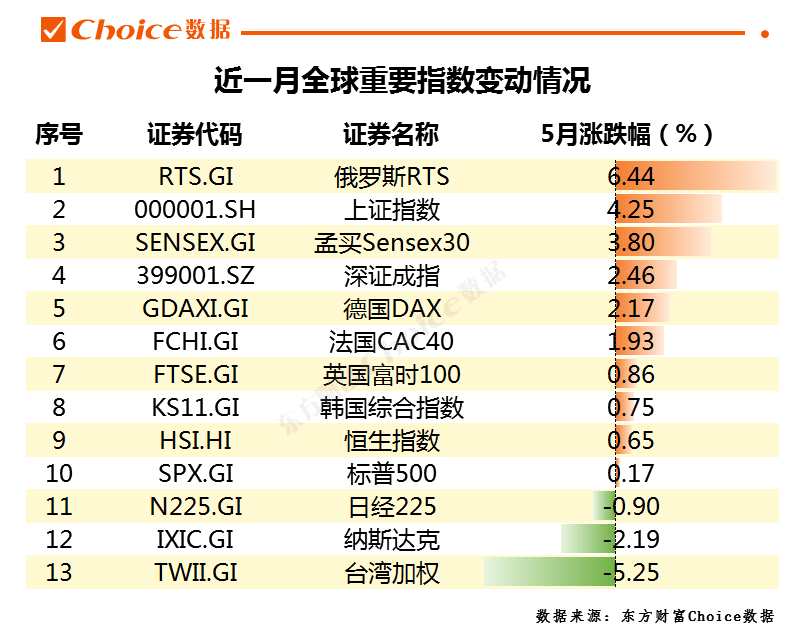 截止至5月26日收盤,A股市場表現(xiàn)較好,上證指數(shù)和深證成指近一月分別上漲4.25%和2.46%,領(lǐng)跌全球市場。