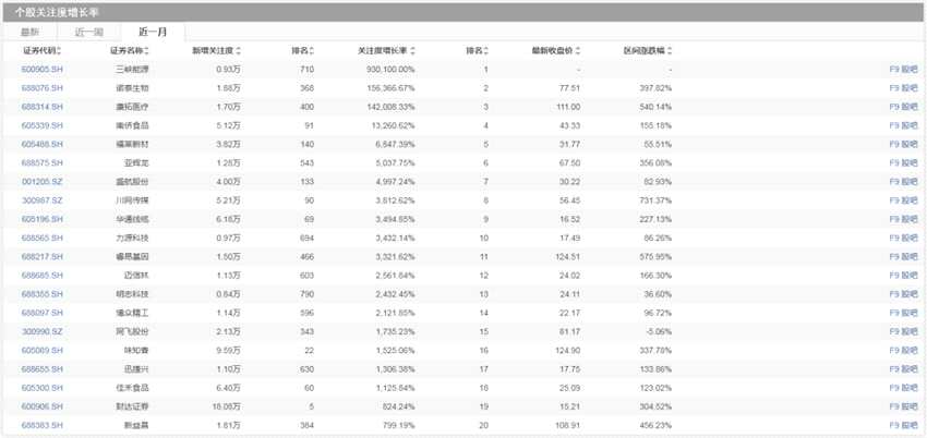 從個股關(guān)注度來看,近一月最受關(guān)注的個股為【三峽能源(600905)、股吧】,新增0.93萬關(guān)注度,關(guān)注度增長率高達930100%;除此之外,諾泰生物關(guān)注度增長率也較高,達到了156366.67%。