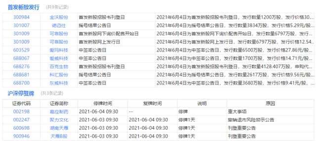 今日申購、停復牌、撤銷ST、限售解禁等提醒: