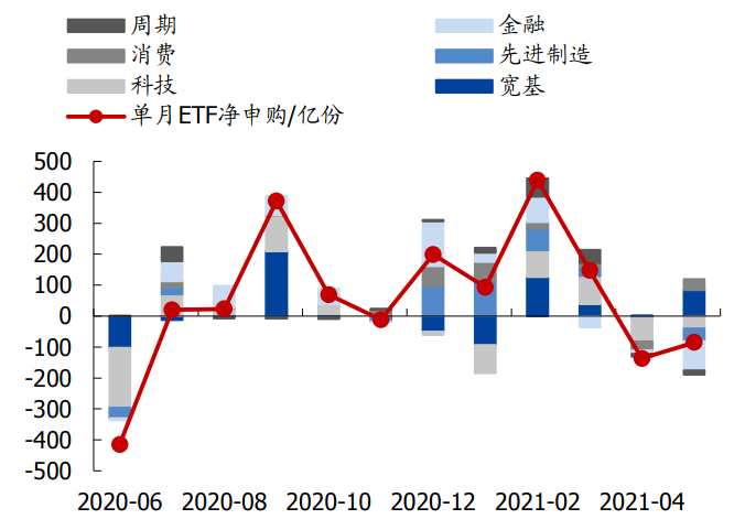 5月ETF凈贖回85億份,其中金融ETF凈贖回最多,寬基ETF凈中購最多。5月ETF凈贖回85億份,比上月少贖回52億份,其中先進(jìn)制造(-41)、金融(-95)、科技(-39)、消費(35)、周期(-14)、寬基(85)、其他(-14)。今年前5月ETF凈中購457億份,先進(jìn)制造(169)、金融(-32)、科技(-29)、消費(108)、周期(94)、寬基(150)、其他(-3),先進(jìn)制造和寬基凈中購最多。