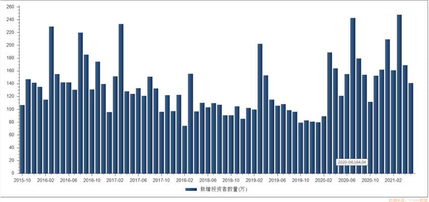4月新增投資者數(shù)量169萬人,環(huán)比減少32%。