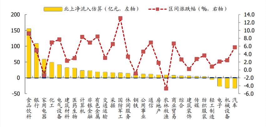 5月北上主要凈流入食品飲料、銀行和家電,分別凈流入154億元、107億元和57億元;同時,汽車、機(jī)械設(shè)備、電子行業(yè)流出居多,分別凈流出31億元、31億元和25億元。
