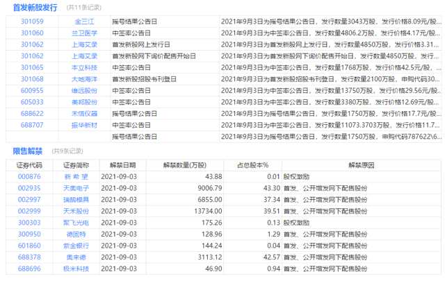 今日申購、限售解禁等提醒: