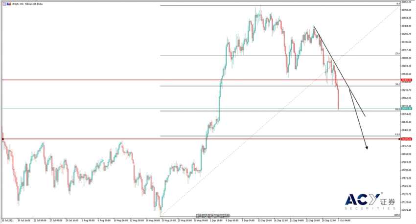 今日早盤,全球股指紛紛跌破關鍵頭部頸線,開啟扭轉局勢。對比各大股指跌幅,日經(jīng)指數(shù)的崩潰速度最快。這可謂是意料之外,情理之中。昨日岸田文雄被選舉為日本第100任首相,其政策主張較為鴿派,與央行的態(tài)度相符,所以市場對其上任也格外期待。不過這種期待早已反映在市場價格當中,早在ACY證券9月7日的分析中,便講解過岸田文雄競選宣言對當時日經(jīng)指數(shù)產生的重要利好影響。