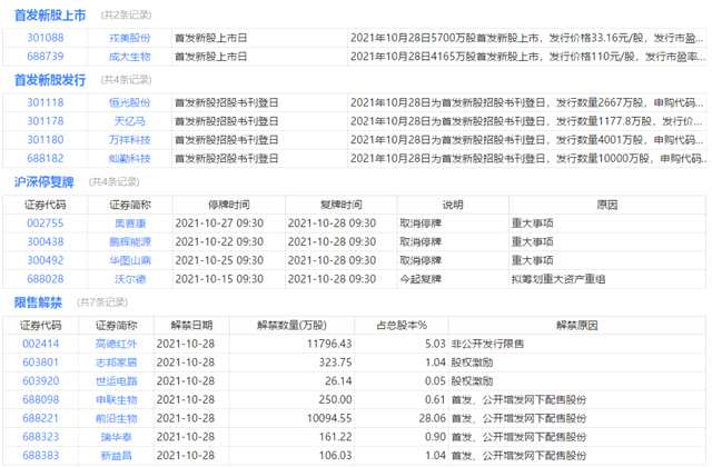 今日上市、申購、停復(fù)牌、限售解禁等提醒: