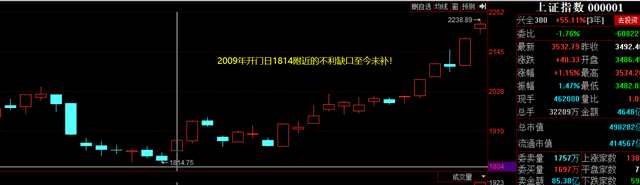 上面兩張圖,說明滬指開市31年來,至少有兩次重要底部附近有不利缺口,卻未補,隨后發(fā)動中級行情。一次是12年前即2009年1月5日1814附近的不利缺口,一次是27年前即1994年325附近的不利缺口。如果揪住1814不利缺口不放,就會錯過2009年1月以后1814到3478的中級大反彈,以及1849到5178的中級牛市。揪住325不利缺口不放,就會錯過325到1052一口氣漲3倍的井噴,以及1996年到2001年多次中級牛市,以及2005年998到2007年6124特大牛市。