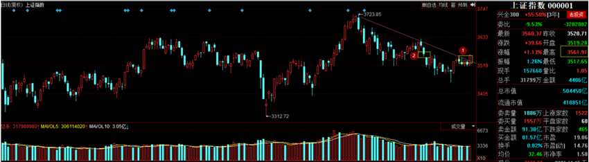 上圖是滬指日線,標(biāo)注1處是我們一直畫的紫線(9月14日3723以來(lái)下降壓力線),標(biāo)注2處是10月下旬3560附近向下跳空缺口。這2個(gè)標(biāo)注,相當(dāng)于空頭的兩大堡壘??砂l(fā)現(xiàn),多頭主力近期對(duì)這2大堡壘發(fā)起了沖擊,一度有搖搖欲墜的感覺,卻在本周五下午最后時(shí)刻,依靠證券板塊發(fā)力,實(shí)現(xiàn)對(duì)紫線(下降壓力線)的翻越。本周是我們上周五認(rèn)定的變盤周,選擇在最后時(shí)刻翻越變盤,可見主力是多么狡猾和有耐心!