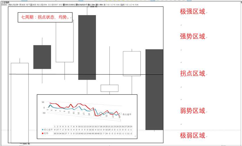 等待兩個交易日的拐點,昨天到來,非常遺憾的是分時在重心3618點沒有形成底部,而是在開盤前30分鐘,甚至前15分鐘,而且是正好15分鐘,就快速下跌,跌破重心。使得拐點機會無法形成買入信號。只能繼續(xù)等待,等待什么呢?1、重心速率由負轉(zhuǎn)正,甚至連續(xù)兩天速率為0;2、優(yōu)勢形成,并且向上突破重心。也就是周二出現(xiàn)的七周期狀態(tài),再次來臨。七周期就是一只獵豹,不見信號不出擊。
