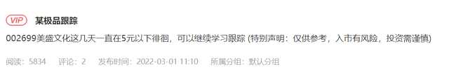 被動(dòng)喜報(bào)又來:002699美盛文化,2月16日我在云掌財(cái)經(jīng)VIP舉例,設(shè)定學(xué)習(xí)點(diǎn)5元以下、4.8以下,實(shí)際最低是2月28日的4.61,破了4.8,3月1日(本周二)再度善意提醒,今日下午怒封漲停、被動(dòng)漲停!別人擔(dān)心指數(shù),我們收獲漲停!