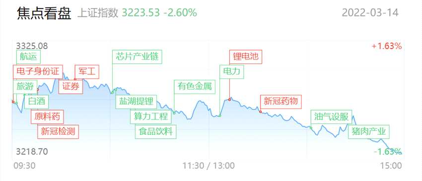 摘要: 3月14日今日大盤低開后震蕩走低,三大指數(shù)均跌超2%,創(chuàng)業(yè)板指領(lǐng)跌。板塊上,今日除電子身份證概念大漲外,今日賺錢效應(yīng)主要集中在抗疫概念上,但也有不少醫(yī)藥股午后大幅回落。