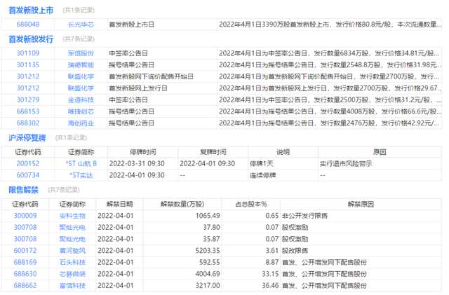 今日上市、申購、停復牌、限售解禁等提醒: