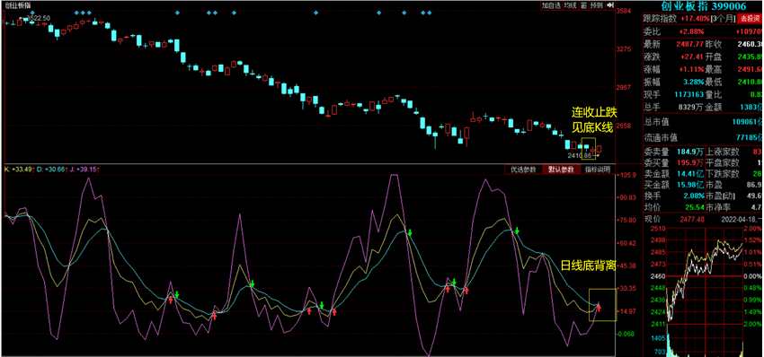 上圖是創(chuàng)業(yè)板日線,可發(fā)現(xiàn),創(chuàng)業(yè)板做為領(lǐng)跌指數(shù)和領(lǐng)先指數(shù),經(jīng)歷去年3500以來(lái)30%左右大跌,上周四、上周五連續(xù)收出我在某音小視頻講解的止跌見(jiàn)底常見(jiàn)K線——長(zhǎng)下影K線。今天創(chuàng)業(yè)板其實(shí)收出連續(xù)第3根長(zhǎng)下影K線,技術(shù)指標(biāo)KDJ出現(xiàn)了指數(shù)今日創(chuàng)2410新低,KDJ卻日線金叉,即創(chuàng)業(yè)板已經(jīng)出現(xiàn)了60分鐘以上級(jí)別的日線級(jí)別底背離,另外也偷偷出現(xiàn)了雙金叉。遺憾是今天創(chuàng)業(yè)板量創(chuàng)了新低,不過(guò)這不正是“這里的黎明靜悄悄么”。沒(méi)人相信市場(chǎng)這里是底部,當(dāng)然會(huì)無(wú)量。如果投資人都相信這里是底部,都大舉進(jìn)場(chǎng),按照多數(shù)人都是錯(cuò)的股市鐵律,底部反而值得懷疑。