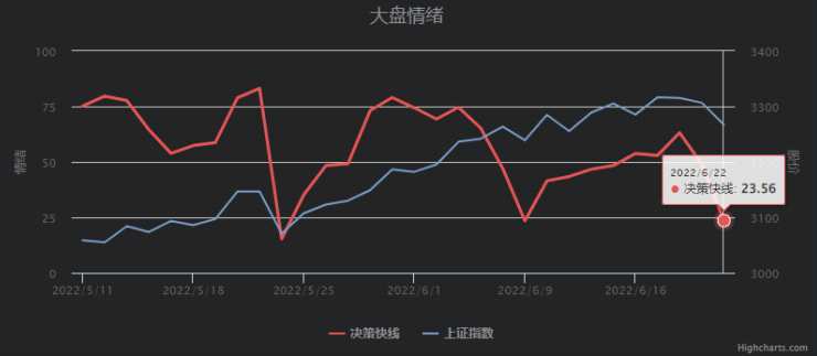 好股道決策快線情緒指數(shù)目前讀數(shù)值為23,處于低位區(qū)。結(jié)合情緒指數(shù)已經(jīng)從06月20日高位回落,并且近期股指以區(qū)間震蕩為主的這種情況分析,這意味著目前市場信心已經(jīng)相對(duì)缺乏。從反身性的角度來看,當(dāng)市場信心不足的情況下,也就意味著股指已經(jīng)處于階段性非理性下跌狀態(tài)(風(fēng)險(xiǎn)釋放尾聲)。情緒指數(shù)回落至低位區(qū)時(shí),投資者可以逐步關(guān)注即將到來的布局機(jī)會(huì)[具體參考情緒指數(shù)使用說明](更新時(shí)間:2022-06-22)。