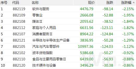 從下跌板塊來看,軟件服務(wù)、零售業(yè)、媒體、家庭與個(gè)人用品等板塊跌幅居前。