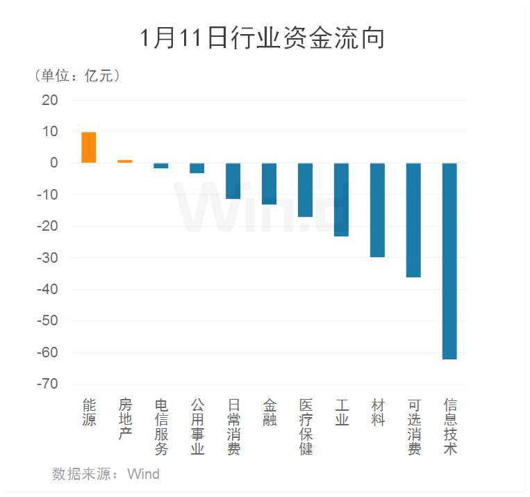 從1月11日行業(yè)資金流向來看,主力資金凈流出180多億元,多數(shù)板塊凈流出。其中,信息技術(shù)板塊凈流出額超60億元,位居首位;可選消費(fèi)、材料、工業(yè)等板塊亦流出額居前;能源、房地產(chǎn)等板塊則小幅凈流入。