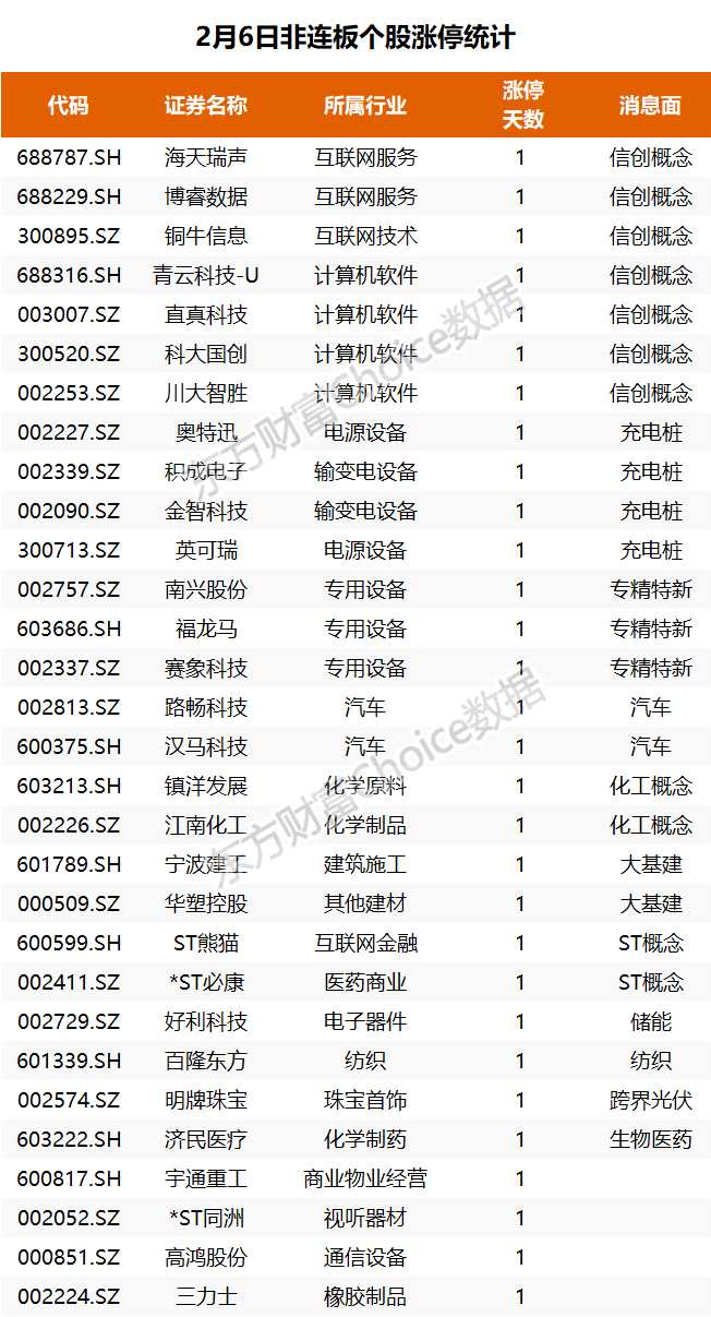 個(gè)股方面,信創(chuàng)概念分化,ChatGPT龍頭漢王科技晉級(jí)6板、云從科技6天3板;數(shù)據(jù)確權(quán)概念安妮股份一度跌停,收盤大跌近8%;人工智能概念川大智勝6天4板,天娛數(shù)科4天3板,潤(rùn)和軟件炸板,科大訊飛漲超9%;數(shù)字經(jīng)濟(jì)板塊華塑控股3天2板、南興股份3天2板;軍工并購(gòu)重組的中航電測(cè)20CM三連板;元宇宙概念股捷榮技術(shù)2板、廣博股份2板?! ?img rel='nofollow' src='http://image.yjcf360.com/202302/ac8abd25578b42289c6bf41092e4b55f.png' border='0' onload='javascript:if(this.width>500)this.width=500' align='center' hspace=10 vspace=10 alt=''>