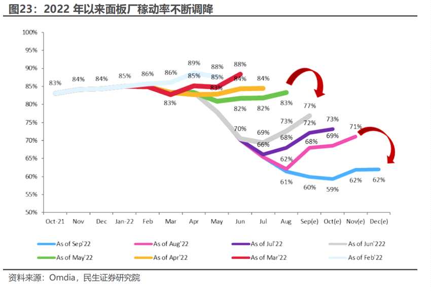 疫情初期供需錯(cuò)配造成的超級(jí)上漲行情下大陸廠商持續(xù)擴(kuò)產(chǎn),韓廠產(chǎn)能退出放緩,行業(yè)產(chǎn)能長(zhǎng)期維持高位,大量產(chǎn)能釋放。隨后需求開始衰退,面板庫(kù)存居高不下,價(jià)格持續(xù)下跌。廠商從1Q22起就開始調(diào)低工作率保價(jià)格,到第二季度末進(jìn)一步大幅調(diào)低到70%。