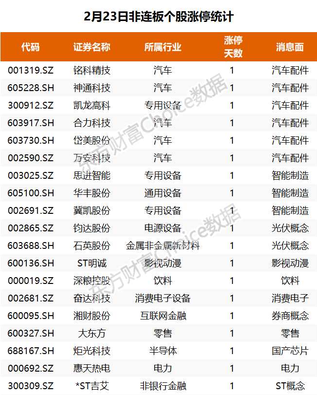 個股方面,券商板塊異動,湘財股份放巨量漲停;天基互聯概念中國衛(wèi)星斷板;毫米波雷達再度大漲,中英科技、東箭科技漲超10%,晉拓股份3連板;光伏等賽道板塊展開反彈,鈞達股份漲停;汽配股活躍,凱龍高科、岱美股份、銘科精技、合力科技等多股漲停;信創(chuàng)概念全線調整,漢王科技跌停,東易日盛上演“準天地板”,海天瑞聲跌超8%?! ?img rel='nofollow' src='http://image.yjcf360.com/202302/ddb53987295348dfae4dfb9b7dcc6240.png' border='0' onload='javascript:if(this.width>500)this.width=500' align='center' hspace=10 vspace=10 alt=''>