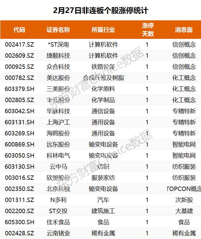 個股方面,酒店旅游股領(lǐng)漲,佳禾食品漲停,天目湖、君亭酒店漲超5%;化工股逆勢活躍,三美股份漲停,興發(fā)集團漲超8%;ChatGPT概念調(diào)整,拓維信息斷板,三六零跌超8%,湯姆貓跌超6%;TOPCON概念北京科銳大陽線漲停,鈞達股份漲超5%;智能電網(wǎng)三變科技炸板,遠東股份、科林電氣漲停;ST概念*ST深南走出“地天板”?! ?img rel='nofollow' src='http://image.yjcf360.com/202302/3cf619c5303c49f091823dc42acc4642.png' border='0' onload='javascript:if(this.width>500)this.width=500' align='center' hspace=10 vspace=10 alt=''>