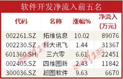機構(gòu)資金流入前五名是計算機設(shè)備、IT服務(wù)、軟件開發(fā)、通信設(shè)備與消費電子板塊。前三位均屬于AI概念板塊,計算機設(shè)備板塊流入19.75億元,IT服務(wù)板塊流入17.54億元,軟件開發(fā)板塊流入15.46億元,通信設(shè)備概念流入11.2億元,消費電子板塊流入11.1億元?! ?img rel='nofollow' src='http://image.yjcf360.com/202303/1200cc9f300e411ab787269d326a7af0.png' border='0' onload='javascript:if(this.width>500)this.width=500' align='center' hspace=10 vspace=10 alt=''> 計算機設(shè)備板塊普漲,81只成分股平均漲幅2.19%。機構(gòu)流入額超過億元的有4只個股,其中中科曙光流入7.71億元,漲幅7.7%,浪潮信息流入5.34億元,漲幅5.14%,大華股份流入3.08億元,漲幅7.5%,??低暳魅?.61億元,漲幅4.39%?! ?img rel='nofollow' src='http://image.yjcf360.com/202303/a26fbc253bb04bc58852a9edcf36bf26.png' border='0' onload='javascript:if(this.width>500)this.width=500' align='center' hspace=10 vspace=10 alt=''> IT服務(wù)板塊出現(xiàn)全面揚升,123只成分股平均漲幅2.9%。機構(gòu)流入額超過億元的個股多達(dá)6只,其中潤和軟件流入3.81億元,漲幅5.64%,紫光股份流入2.81億元,漲幅5.12%,光環(huán)新網(wǎng)流入1.88億元,漲幅16.35%,常山北明流入1.4億元,漲幅5.64%,金財互聯(lián)流入1.23億元,漲幅7.66%,神州數(shù)碼流入1.02億元,漲幅6.29%?! ?img rel='nofollow' src='http://image.yjcf360.com/202303/309846c4861448fcb3072269ed21398d.png' border='0' onload='javascript:if(this.width>500)this.width=500' align='center' hspace=10 vspace=10 alt=''> 軟件開發(fā)板塊也出現(xiàn)普漲,124只成分股平均漲幅1.55%。機構(gòu)流入額超過億元的有4只個股,其中拓維信息漲停,流入8.91億元,科大訊飛流入3.14億元,漲幅1.44%,三六零流入2.25億元,漲幅6.61%,四維圖新流入1.18億元,漲幅2.43%。