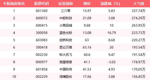 4月28日,滬深兩市延續(xù)了前兩天的普漲格局,滬深兩市漲幅均超1%,而市場人氣龍頭板塊人工智能也不負(fù)眾望,在五一假期前最后一個(gè)交易日大幅上漲,一掃昨日集體跳水的陰霾。此外中字頭、大金融板塊也有所表現(xiàn),下面是今日十大人氣股排名的詳細(xì)情況。