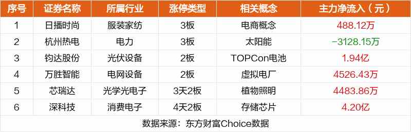 其中,電商概念日播時尚3板,太陽能杭州熱電3板,TOPCon電池鈞達股份2板。