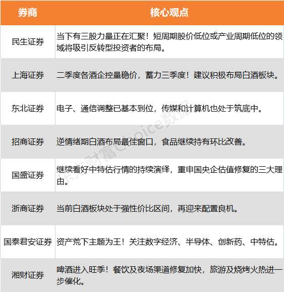 就此,尋找當(dāng)前市場(chǎng)風(fēng)口,民生證券表示,當(dāng)下有三股力量正在匯聚,短周期股價(jià)低位或產(chǎn)業(yè)周期低位的領(lǐng)域?qū)⑽崔D(zhuǎn)型投資者的布局;招商證券指出,逆情緒期白酒布局最佳窗口,食品繼續(xù)持有環(huán)比改善;國(guó)盛證券認(rèn)為,看好中特估行情的持續(xù)演繹,重申國(guó)央企估值修復(fù)的三大理由。