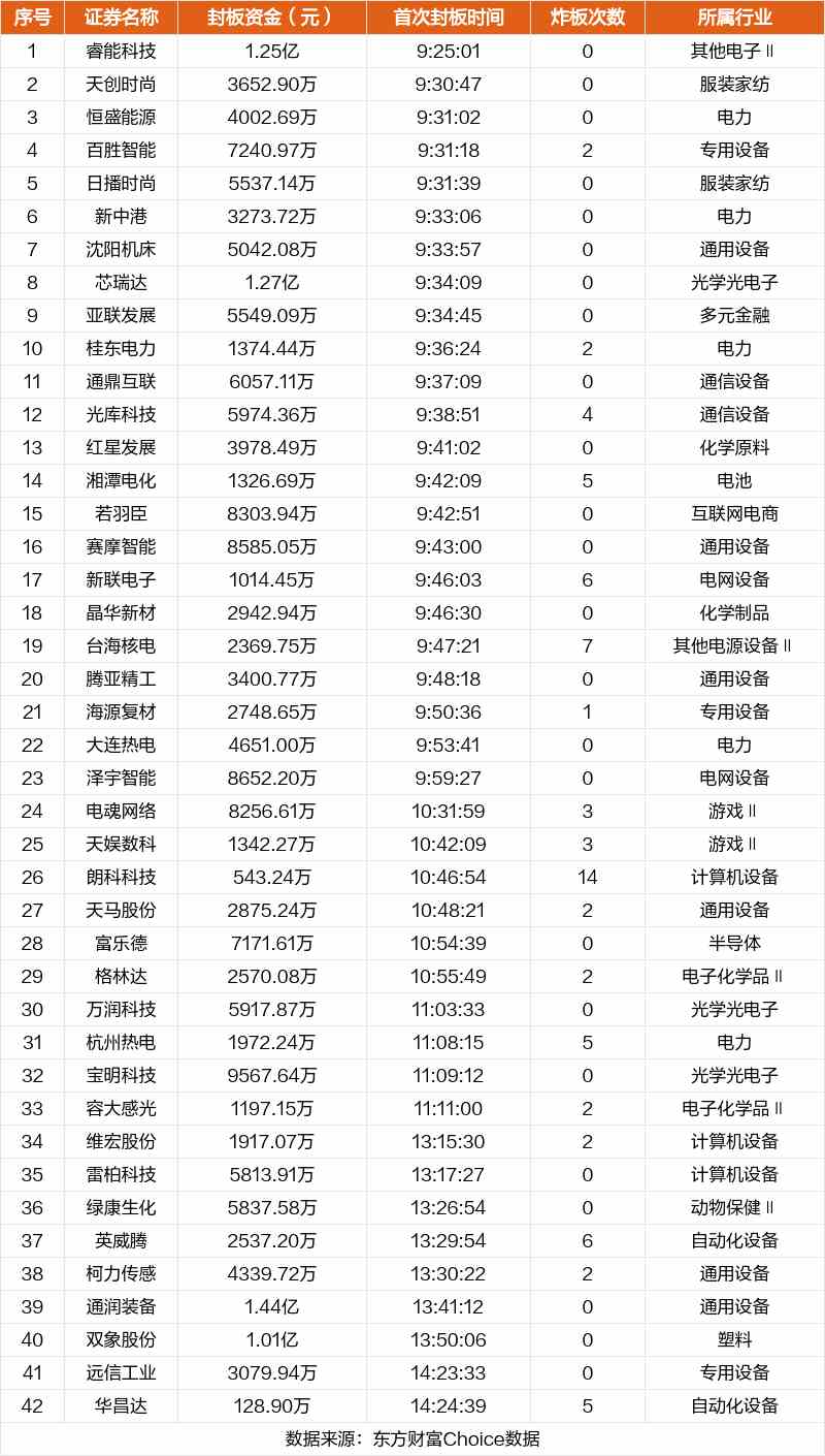 從首次封板時(shí)間角度看,今日42只非ST股中,天創(chuàng)時(shí)尚、恒盛能源、百勝智能等在開盤5分鐘內(nèi)首次觸板。