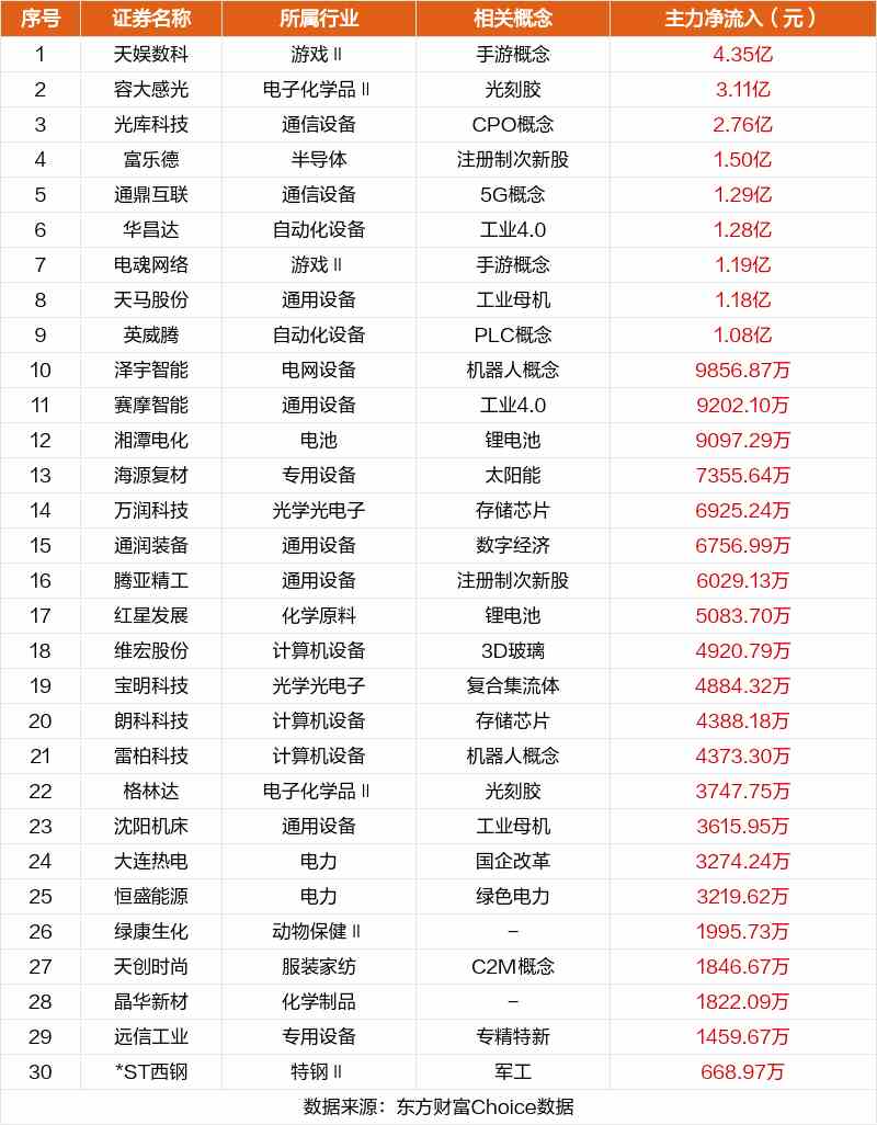 非連板個(gè)股方面,天娛數(shù)科、容大感光、光庫科技主力資金凈流入居前。