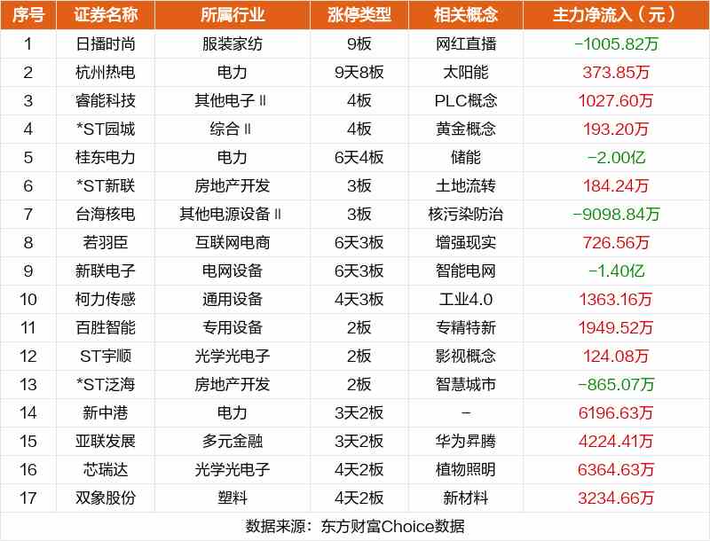 其中,網(wǎng)紅直播日播時(shí)尚9板,太陽能杭州熱電9天8板,PLC概念睿能科技4板。