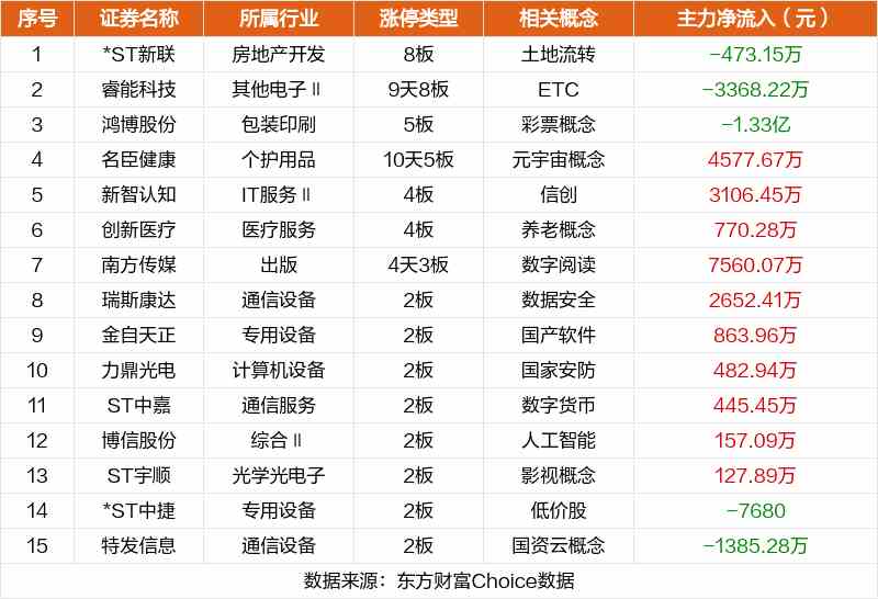 其中,土地流轉(zhuǎn)*ST新聯(lián)8板,ETC睿能科技9天8板,彩票概念鴻博股份5板。