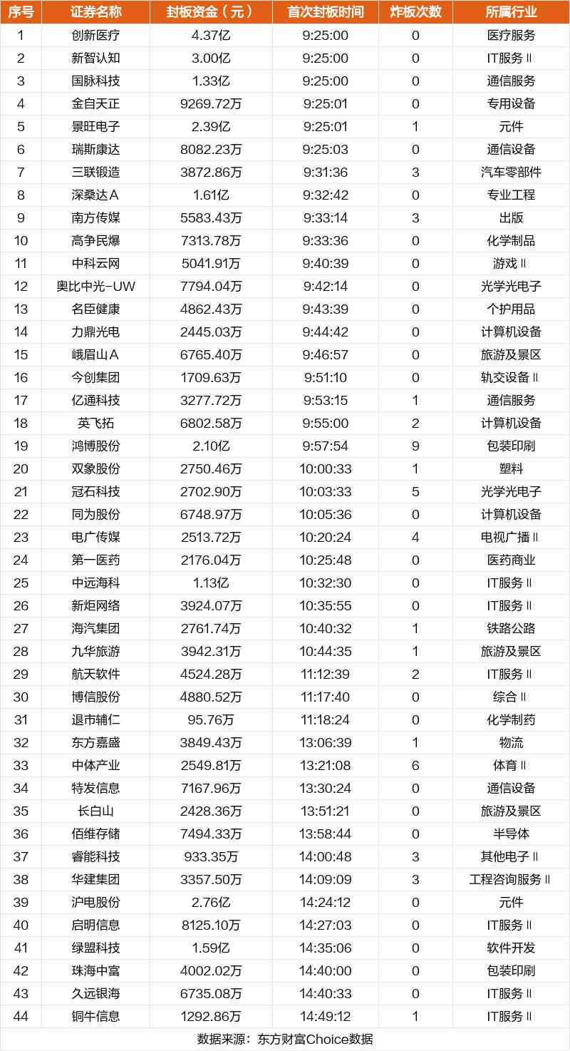 從首次封板時間角度看,今日44只非ST股中,三聯(lián)鍛造、深桑達A、南方傳媒等在開盤5分鐘內(nèi)首次觸板。