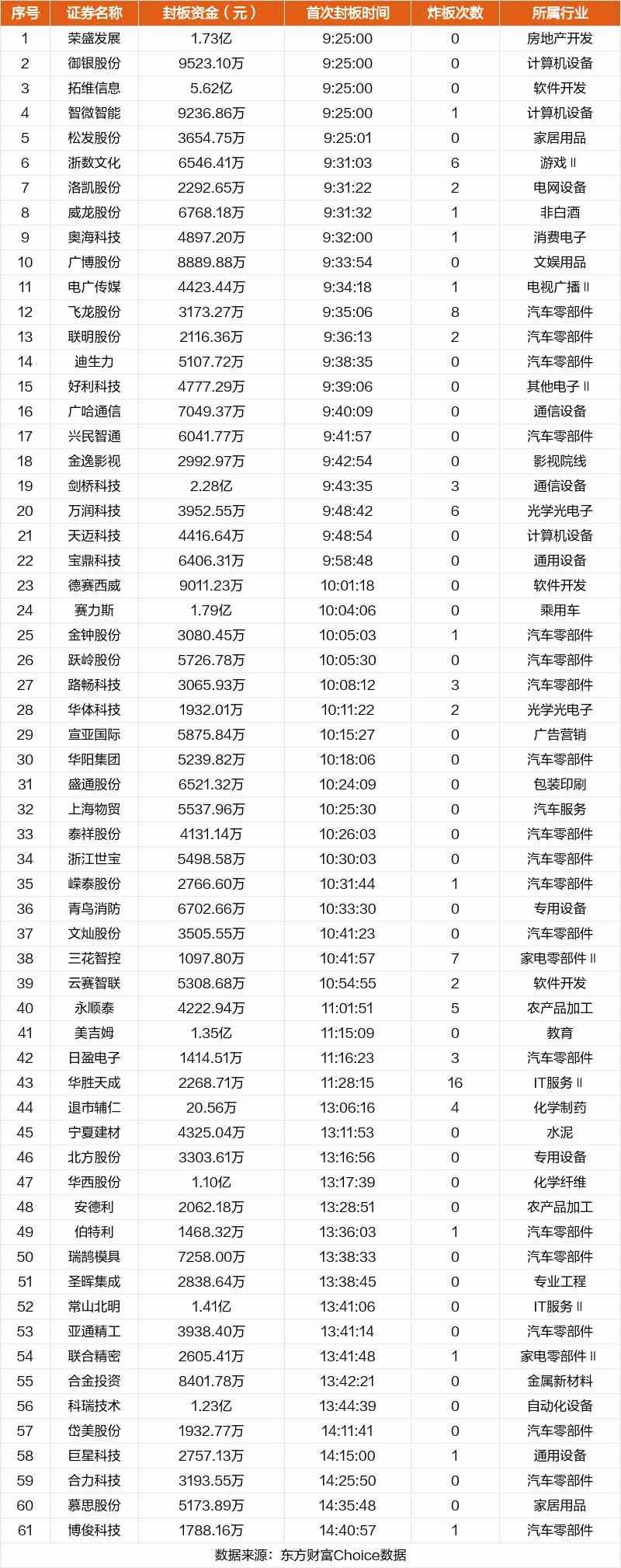 從首次封板時間角度看,今日61只非ST股中,浙數(shù)文化、洛凱股份、威龍股份等在開盤5分鐘內(nèi)首次觸板。