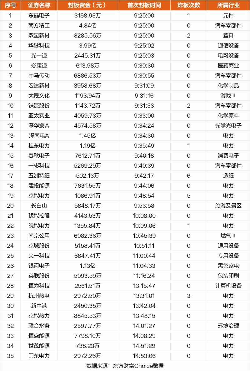 從首次封板時間角度看,今日35只非ST股中,必康退、中馬傳動、宏達新材等在開盤5分鐘內(nèi)首次觸板。
