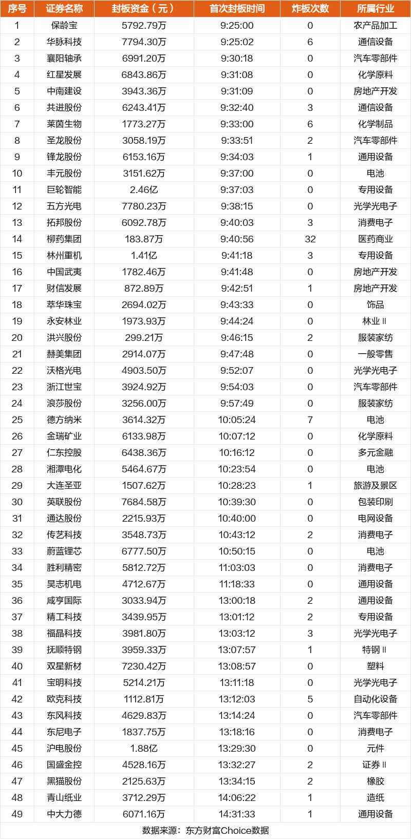 從首次封板時間角度看,今日49只非ST股中,襄陽軸承、紅星發(fā)展、中南建設(shè)等在開盤5分鐘內(nèi)首次觸板。