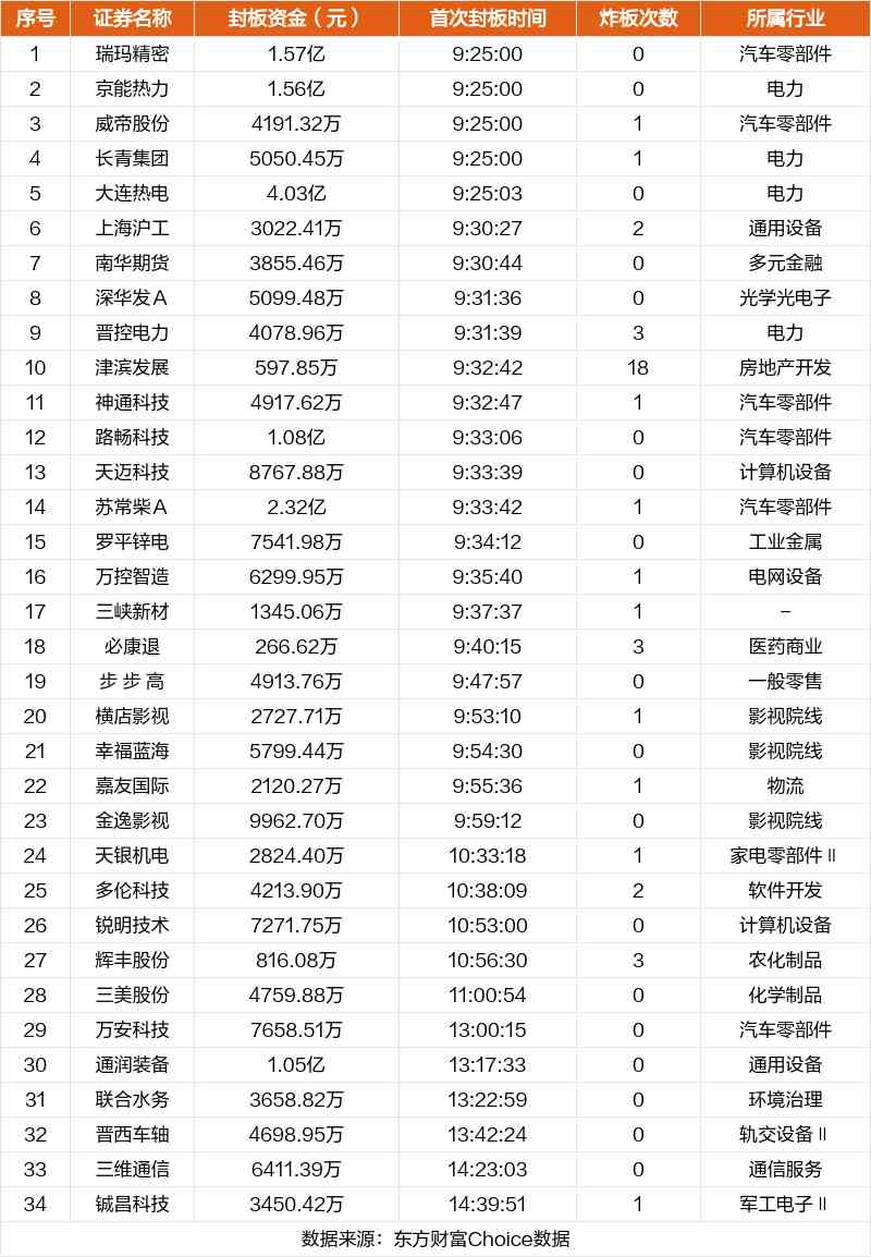 從首次封板時(shí)間角度看,今日34只非ST股中,上海滬工、南華期貨、深華發(fā)A等在開盤5分鐘內(nèi)首次觸板。