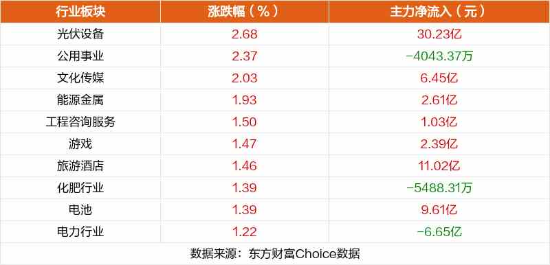 板塊方面,光伏設(shè)備、公用事業(yè)、文化傳媒等板塊漲幅居前,保險(xiǎn)、汽車整車、電機(jī)等板塊跌幅居前。