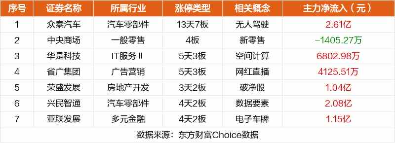 其中,無人駕駛眾泰汽車13天7板,新零售中央商場4板,空間計(jì)算華是科技5天3板。
